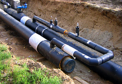 правило, трубопроводы укладывают в специальные бетонные лотки на глубине минимум 2 метра. В настоящий момент при монтаже тепловых сетей применяют трубы в ППУ изоляции. Данный материал прост в монтаже, при этом не требуется дополнительных затрат для монтажа тепловой изоляции, так как трубы изготавливаются уже с изоляцией.